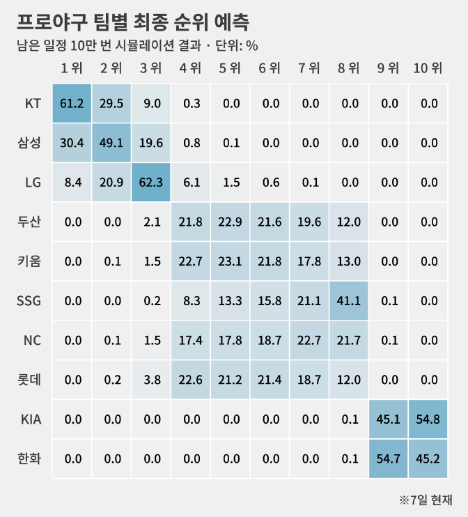 물론 5~8위가 촘촘하게 몰려 있는 상황이라 매일 매일 이 확률도 달라질 수 있습니다.