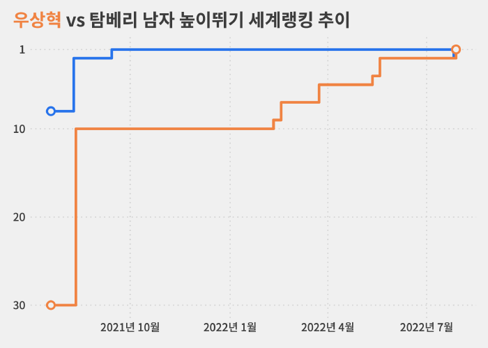 도쿄 올림픽 4위로 랭킹을 10위까지 끌어올린 우상혁은 이로부터 50주 만에 랭킹 1위로 올라섰습니다.
