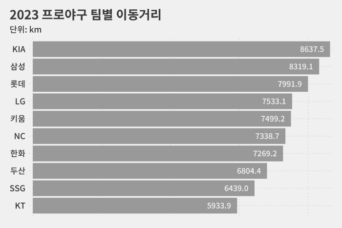 올해 가장 이동거리가 긴 KIA(8637.5㎞)는 가장 짧은 KT(5933.9㎞)보다 2703.6㎞를 더 움직여야 합니다.
