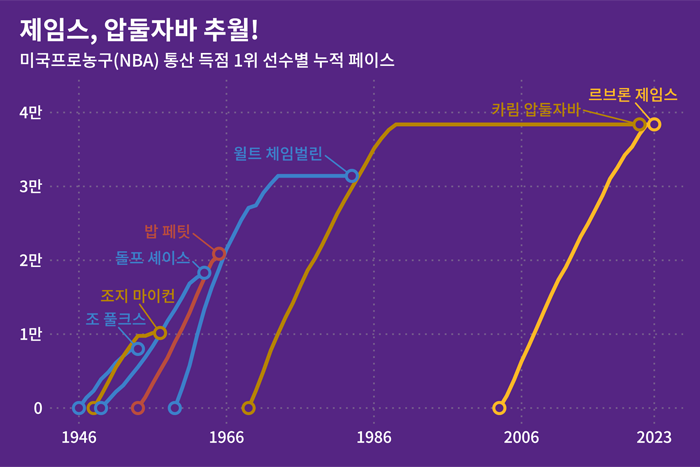 그사이 통산 득점 2~10위는 모두 바뀌었지만 이날 전까지 1위는 늘 압둘자바였습니다.
