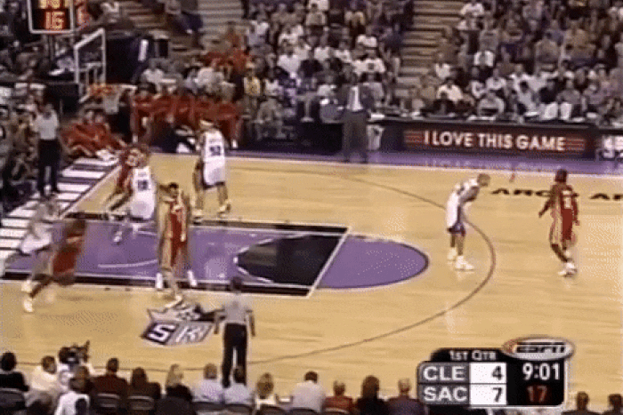 제임스는 펌핑 동작 세 번으로 윌리엄스를 밀어낸 뒤 방향을 바꿔 뒤로 점프하며 슛을 날렸습니다.