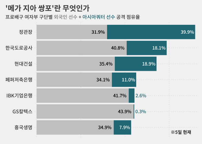 그리고 이 중 260번(39.9%)을 아시아쿼터(AQ) 선수 메가(24·인도네시아), 208번(31.9%)을 외국인 선수 지아(25·미국)가 책임졌습니다.
