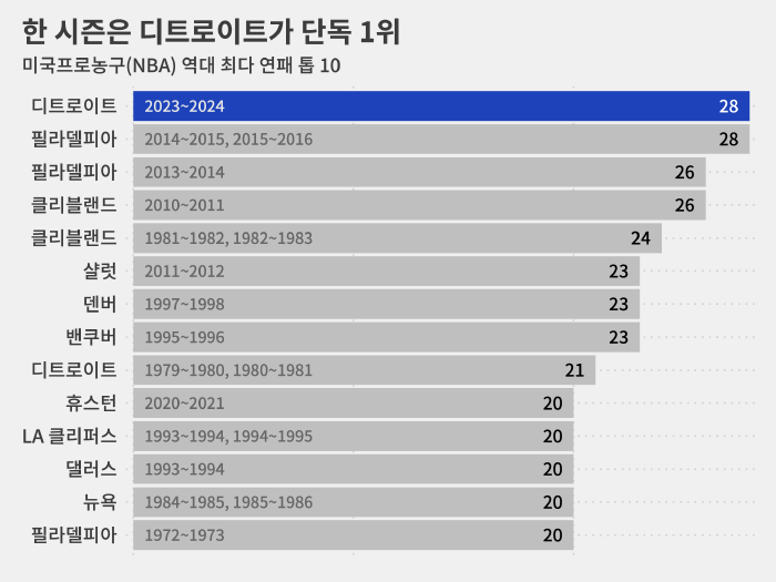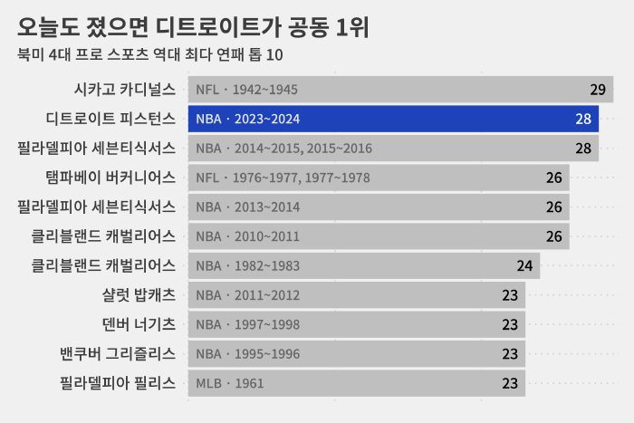다만 한 시즌을 기준으로 하면 디트로이트가 28경기에서 연속으로 패한 게 리그 최다 연패 단독 1위 기록입니다.
