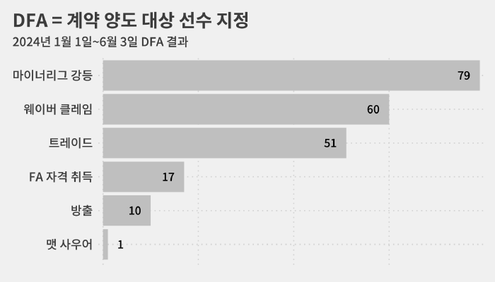 이어 △트레이드 51건 △FA 자격 취득 17건 △방출 10건 순서였습니다.