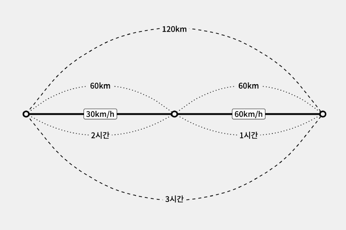 그러면 이때 평균 속력은 시속 45km( = (30 + 60) ÷ 2)일까요?