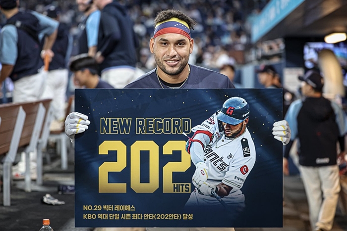 레이예스는 프로야구 역대 2위에 해당하는 시즌 200안타를 기록한 채로 롯데가 5-1 승리를 거둔 1일 창원 방문 경기를 시작했습니다.