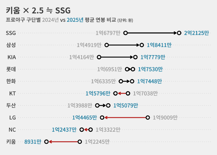 새 시즌 연봉 총액이 100억 원을 넘는 팀은 SSG뿐입니다.