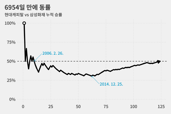 이로부터 49개월이 지난 현재 삼성화재(.616)는 대한항공(.641)에도 통산 승률이 뒤진 상태입니다.