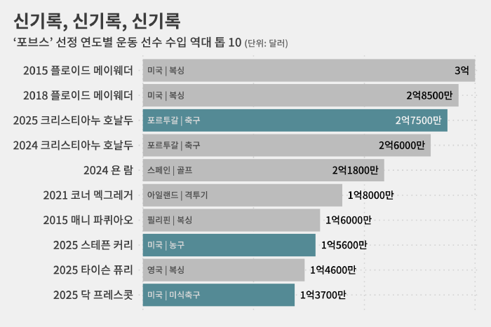 이전에는 르브론 제임스(41·미국)가 지난해 1억2820만 달러를 벌어들인 게 기록이었습니다.